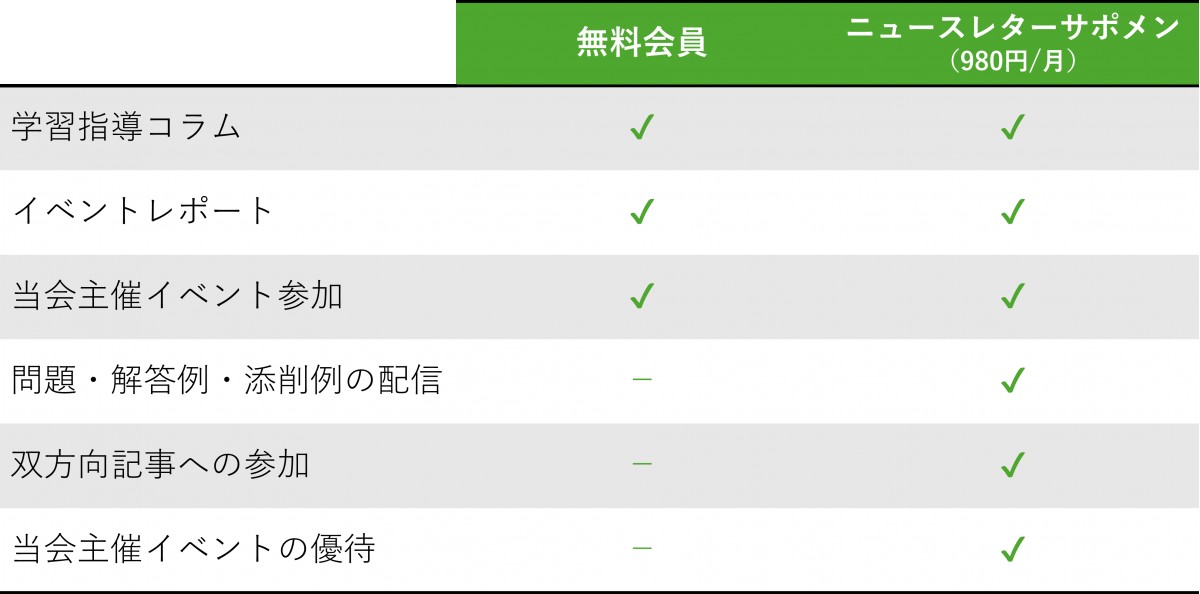 無料の読者会員は、週に1回学習指導コラム(通称“β版”)がメールで届きます。また、当会主催イベントのレポート記事や、会員限定イベントへの参加も可能です。